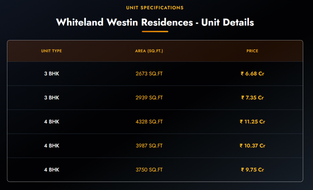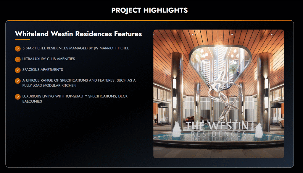 Whiteland Westin Residences is an ultra-luxury residential development in sector 103, Dwarka Expressway that will bring global style of hospitality-style living to Gurugram. The project is spread on 6.15 acres and consists of 9 high-quality towers that contain 412 exclusive homes that are built on modern architecture, luxurious interior, and landscaped open space aspects. These branded residences will provide ample 3 and 4 BHK plans and the latest facilities such as a large entrance lobby, clubhouse, fitness centers, children playing areas, and advanced Tier-3 security. Another great investment opportunity with the project is that it is highly connected with the IGI Airport, NH-8, and other key business centers. The Whiteland Westin Residences brochure is very specific in terms of floor plans, specifications, and prices. Due to the growing popularity of luxury living in the Dwarka Expressway area, the value and pricing of Whiteland Westin Residences, Gurugram, will make it the right investment option to end-users and investors looking to have a high-end home.