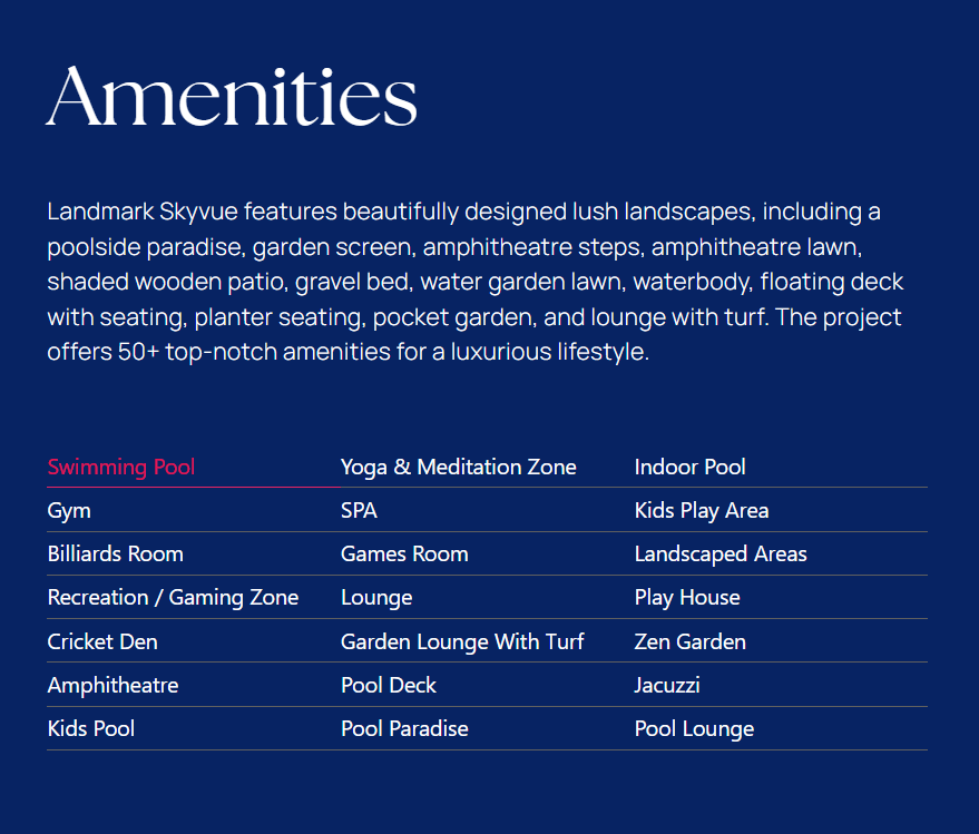 Landmark Skyvue is a gated community with multi-tier security, two levels of basement car parking, and lush landscaped surroundings. You also get access to a world-class clubhouse with spa, specialty Japanese restaurant, temperature-controlled swimming pool, infinity edge pool, pickleball court, and indoor & outdoor sports areas.