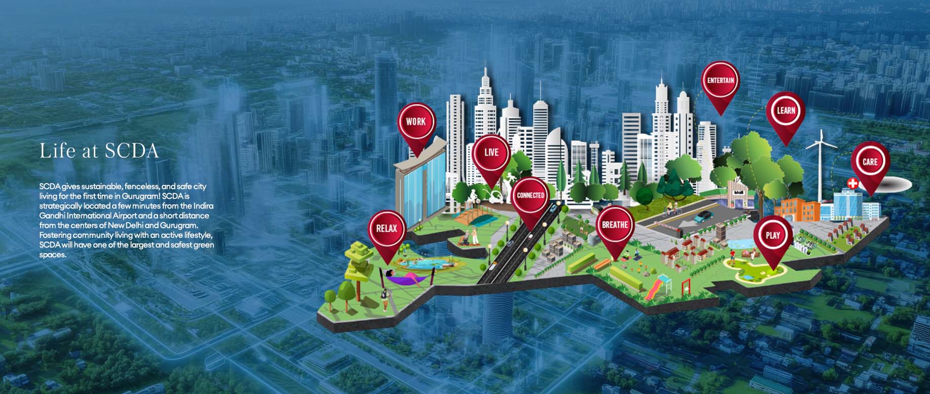 Spanning 250 acres (101 hectares*) of uninterrupted expanse, SCDA is Gurgaon’s first large-scale integrated township—crafted around the principles of sustainability, elevated quality of life, and multi-generational living. Its visionary master plan draws from global best practices in peoplecentric urban design, shaped in collaboration with some of the world’s foremost planning experts.